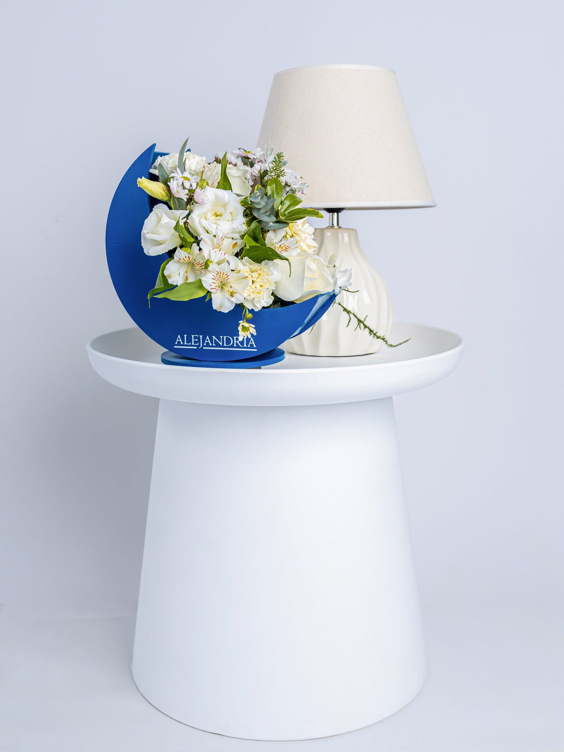 Su diseño en forma de media luna combina flores frescas en tonos blancos, crema y verdes suaves, evocando la calma y pureza de un recién nacido.