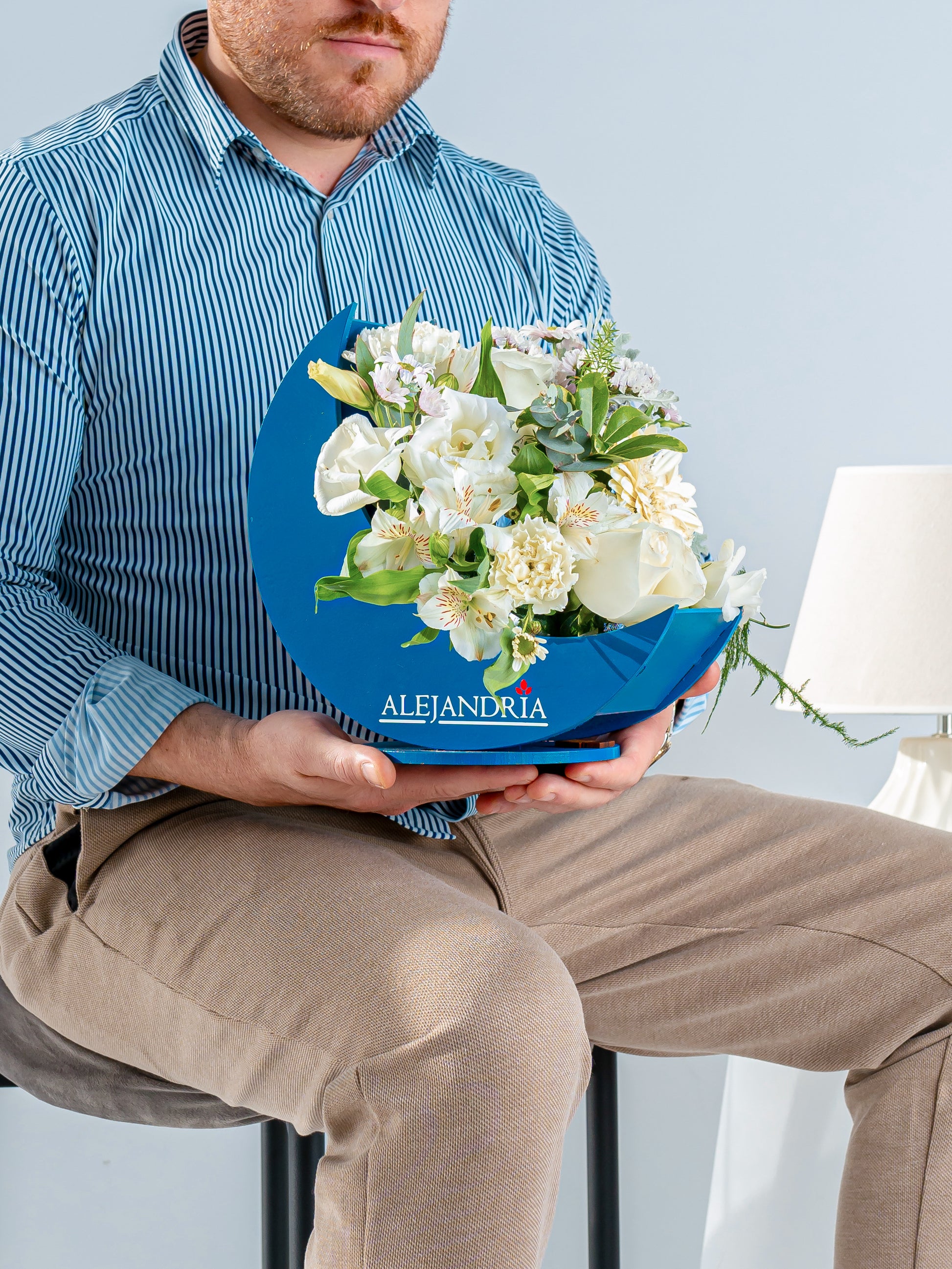 Cada flor fue cuidadosamente seleccionada y dispuesta sobre una base de madera con espuma floral hidratante, asegurando frescura y belleza por varios días.