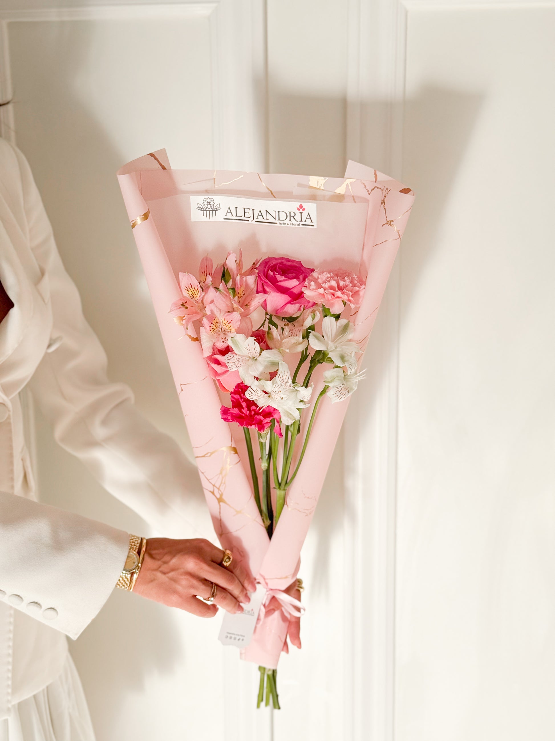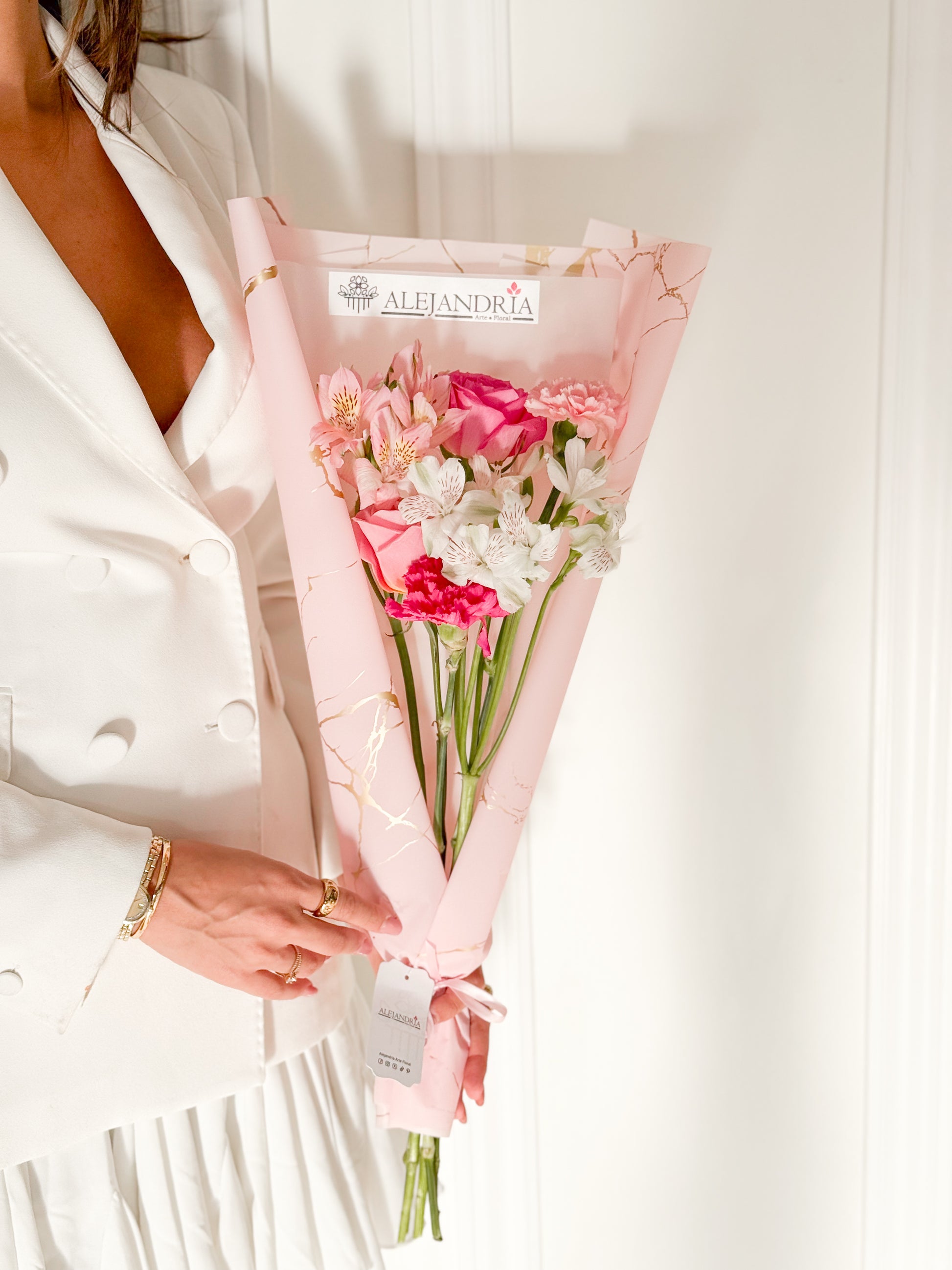 Diseñado en una envoltura con delicados detalles, este bouquet combina la frescura de flores en tonos rosados y blancos, logrando una estética limpia, moderna y encantadora.
