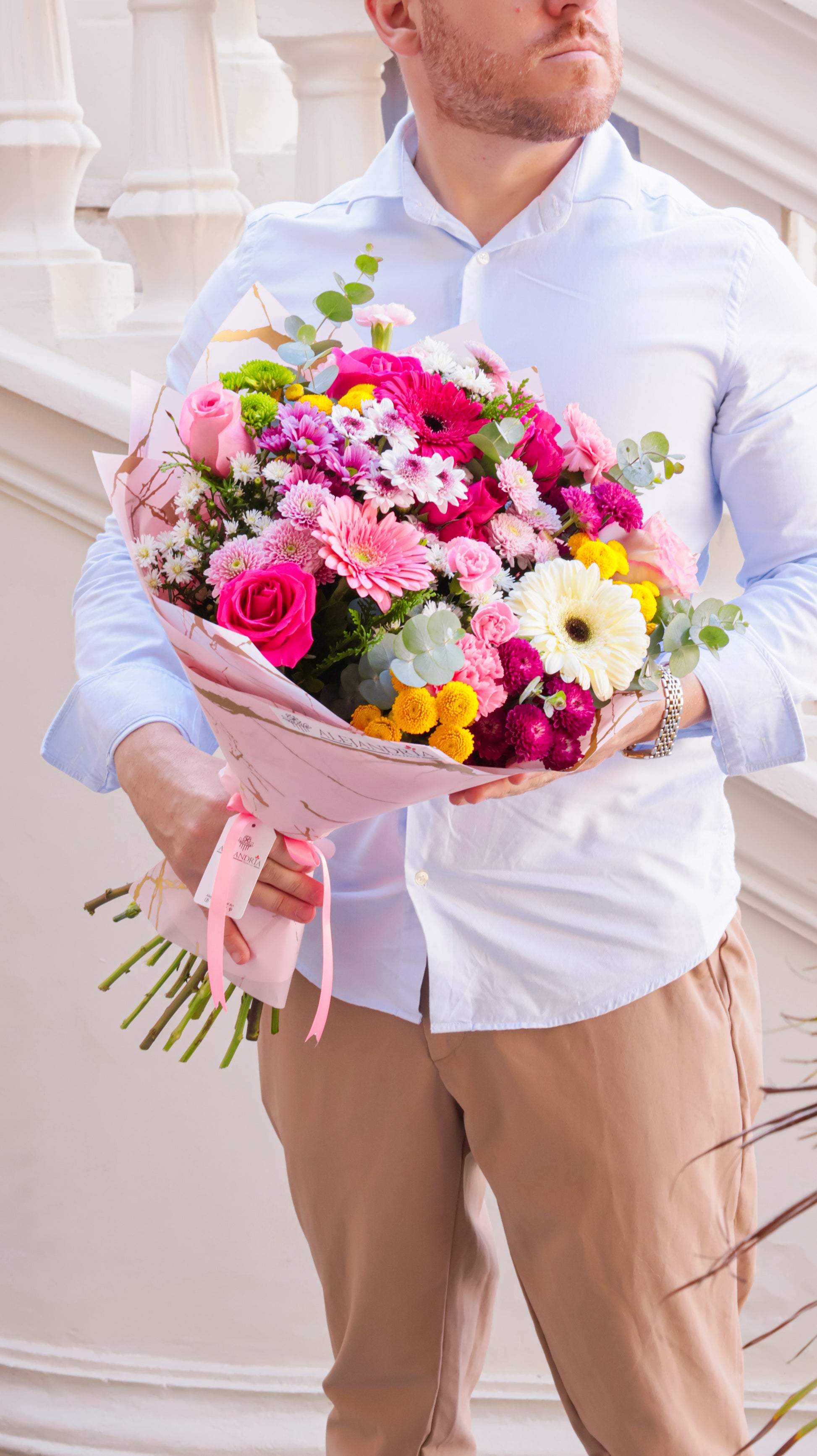 ⚠️ Importante: Cada ramo es único. Las variedades o tonos de flores pueden variar ligeramente según la disponibilidad estacional, pero siempre mantendrán la estética, armonía y calidad que distinguen a Alejandría.
